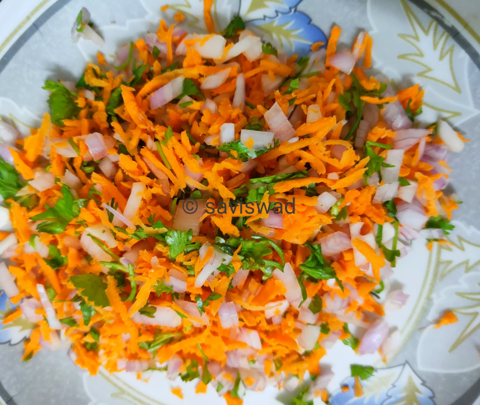 - Take a plate, add grated carrot, chopped onion and coriander leaves. Mix gently and keep it aside.