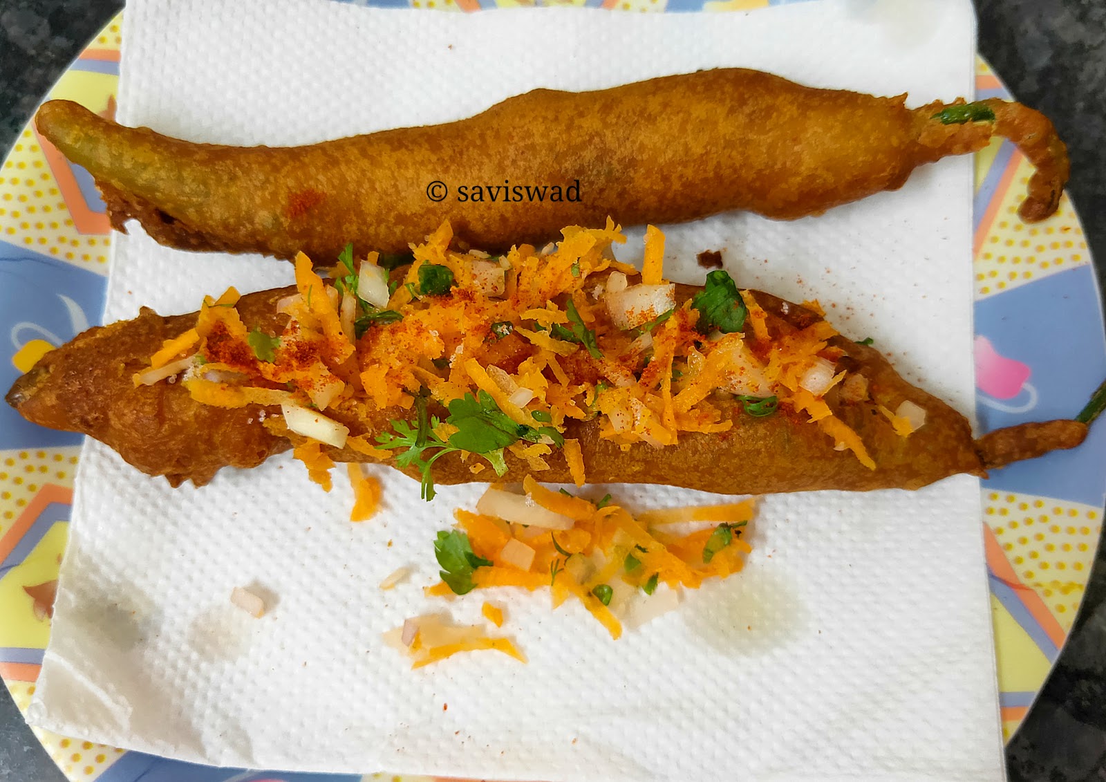 - Now slit the hot & crispy Mirchi in the centre and stuff the carrot, onion & coriander masala in the centre.