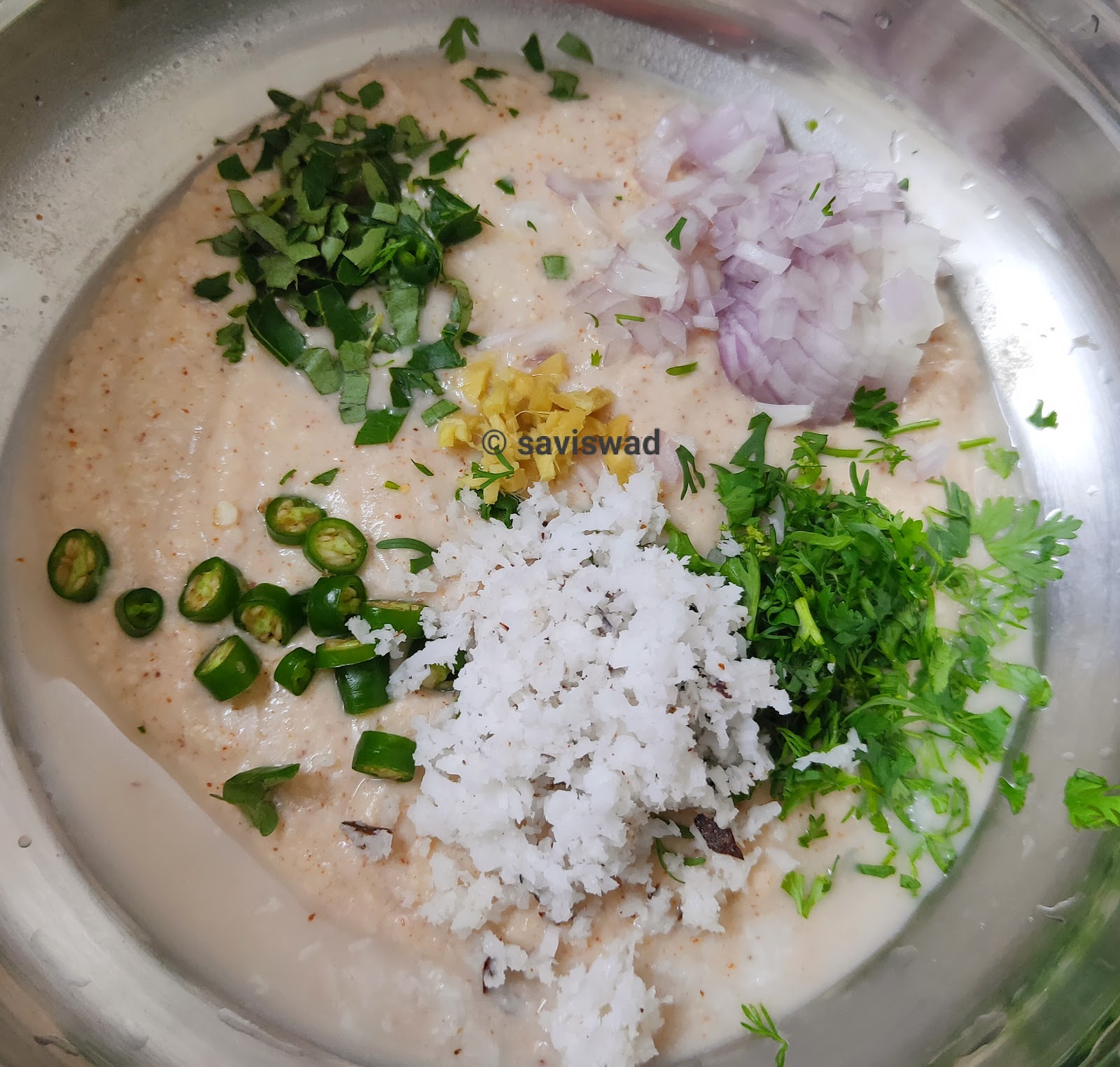 - Now transfer the blended paste into a bowl and add onion, grated coconut, coriander leaves, curry leaves, ginger, green chilli, salt and mix well