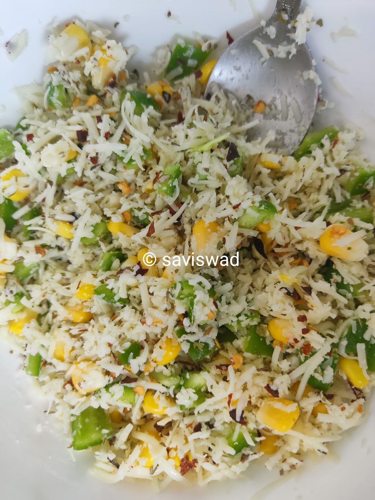 - Take a bowl and add cheese, capsicum, sweet Corn, chili flakes, oregano and mix well with the help of spoon
